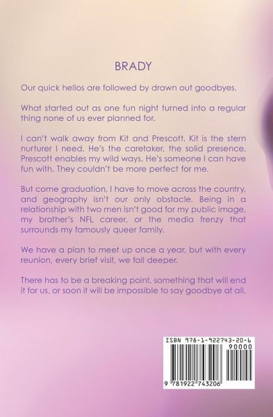 BRADY Our quick hellos are followed by drawn out goodbyes. What started out as one fun night turned into a regular thing none of us ever planned for. I can't walk away from Kit and Prescott. Kit is the stern nurturer I need. He's the caretaker, the solid presence. Prescott enables my wild ways. He's someone I can have fun with. They couldn't be more perfect for me. But come graduation, I have to move across the country, and geography isn't our only obstacle. Being in a relationship with two men isn't good for my public image, my brother's NFL career, or the media frenzy that surrounds my famously queer family. We have a plan to meet up once a year, but with every reunion, every brief visit, we fall deeper. There has to be a breaking point, something that will end it for us, or soon it will be impossible to say goodbye at all.