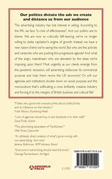This is an analysis of how and why the UK advertising industry's left-leaning politics are influencing the work we're producing and distancing us from the audience we are supposed to be creating our advertising for. We have lost the ability and the will, to sell products and services, and are instead intent on saving the world.