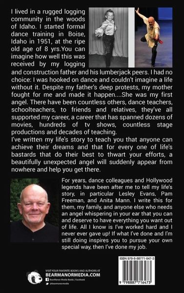 I lived in a rugged logging community in the woods of Idaho. I started formal dance training in Boise, Idaho in 1951, at the ripe old age of 8 yrs. You can imagine how well this was received by my logging and construction father and his lumberjack peers. I had no choice: I was hooked on dance and couldn't imagine a life without it. Despite my father's deep protests, my mother fought for me and made it happen....She was my first angel. There have been countless others, dance teachers, schoolteachers, to friends and relatives, they've all supported my career, a career that has spanned dozens of movies, hundreds of tv shows, countless stage productions and decades of teaching. I've written my life's story to teach you that anyone can achieve their dreams and that for every one of life's bastards that do their best to thwart your efforts, a beautifully unexpected angel will suddenly appear from nowhere and help you get there. For years, dance colleagues and Hollywood legends have been after me to tell my life's story, in particular Lesley Evans, Pam Freeman, and Anita Mann. I write this for them, my family, and anyone else who needs an angel whispering in your ear that you can and deserve to have everything you want out of life. All I know is I've worked hard and I never ever gave up! If what I've done and I'm still doing inspires you to pursue your own special way, then I've done my job.