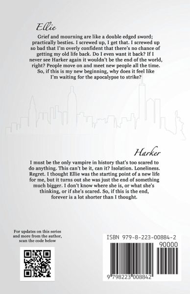 Ellie Grief and mourning are like a double edged sword; practically besties. I screwed up, I get that. I screwed up so bad that I'm overly confident that there's no chance of getting my old life back. Do I even want it back? If I never seen Harker again it wouldn't be the end of the world, right? People move on and meet new people all the time. So, if this is my new beginning, why does it feel like I'm waiting for the apocalypse to strike? Harker I must be the only vampire in history that's too scared to do anything. This can't be it, can it? Isolation. Loneliness. Regret. I thought Ellie was the starting point of a new life for me, but it turns out she was just the end of something much bigger. I don't know where she is, or what she's thinking, or if she's scared. So, if this is the end, forever is a lot shorter than I thought.