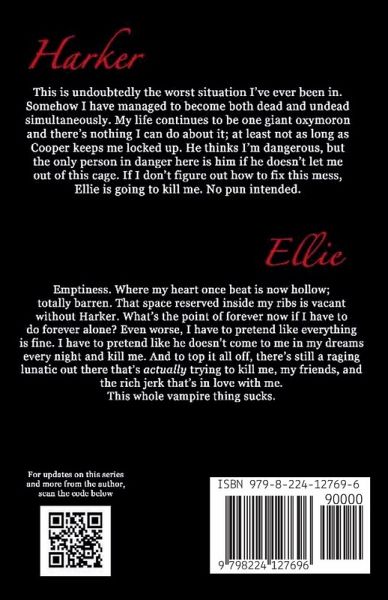 Harker This is undoubtedly the worst situation I've ever been in. Somehow I have managed to become both dead and undead simultaneously. My life continues to be one giant oxymoron and there's nothing I can do about it; at least not as long as Cooper keeps me locked up. He thinks I'm dangerous, but the only person in danger here is him if he doesn't let me out of this cage. If I don't figure out how to fix this mess, Ellie is going to kill me. No pun intended. Ellie Emptiness. Where my heart once beat is now hollow; totally barren. That space reserved inside my ribs is vacant without Harker. What's the point of forever now if I have to do forever alone? Even worse, I have to pretend like everything is fine. I have to pretend like he doesn't come to me in my dreams every night and kill me. And to top it all off, there's still a raging lunatic out there that's actually trying to kill me, my friends, and the rich jerk that's in love with me. This whole vampire thing sucks.