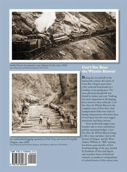 A one-of-a-kind readable history of the railroads that helped develop the timber and coal resources of Coos County, Oregon from 1850 to 1930. During the second half of the nineteenth century, the towns of Coos Bay, Oregon, grew from a few scattered homesteads to a bustling, ocean-going port. The area's phenomenal growth was fueled by timber and coal. Nothing was more important in developing these resources than railroads. Can't You Hear the Whistle Blowin' is the complete story of how these vital transportation links were built by daring entrepreneurs who drove lines of steel into the area's rugged mountains and deep canyons. From backwoods engines and wooden rails to town celebrations and bay-spanning bridges, Can't You Hear the Whistle Blowin' brings to life a time and place vital to the history of Oregon and the West. Author, William A. "Bill" Lansing has drawn upon decades of first-hand knowledge of the area, backed by hundreds of facts and figures, and countless hours of historical research, to produce a compendium of colorful stories of this robust time. This full-color book is illustrated with over 220 historical photographs. This is the new in-print book. (Previous version is now "out of print".)