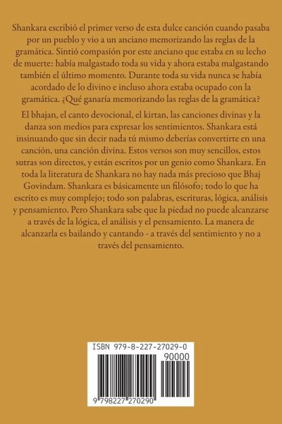 Shankara escribió el primer verso de esta dulce canción cuando pasaba por un pueblo y vio a un anciano memorizando las reglas de la gramática. Sintió compasión por este anciano que estaba en su lecho de muerte: había malgastado toda su vida y ahora estaba malgastando también el último momento. Durante toda su vida nunca se había acordado de lo divino e incluso ahora estaba ocupado con la gramática. ¿Qué ganaría memorizando las reglas de la gramática? El bhajan, el canto devocional, el kirtan, las canciones divinas y la danza son medios para expresar los sentimientos. Shankara está insinuando que sin decir nada tú mismo deberías convertirte en una canción, una canción divina. Estos versos son muy sencillos, estos sutras son directos, y están escritos por un genio como Shankara. En toda la literatura de Shankara no hay nada más precioso que Bhaj Govindam. Shankara es básicamente un filósofo; todo lo que ha escrito es muy complejo; todo son palabras, escrituras, lógica, análisis y pensamiento. Pero Shankara sabe que la piedad no puede alcanzarse a través de la lógica, el análisis y el pensamiento. La manera de alcanzarla es bailando y cantando - a través del sentimiento y no a través del pensamiento.