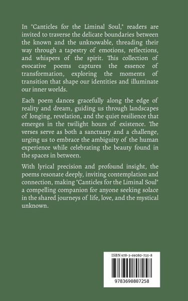 In "Canticles for the Liminal Soul," readers are invited to traverse the delicate boundaries between the known and the unknowable, threading their way through a tapestry of emotions, reflections, and whispers of the spirit. This collection of evocative poems captures the essence of transformation, exploring the moments of transition that shape our identities and illuminate our inner worlds. Each poem dances gracefully along the edge of reality and dream, guiding us through landscapes of longing, revelation, and the quiet resilience that emerges in the twilight hours of existence. The verses serve as both a sanctuary and a challenge, urging us to embrace the ambiguity of the human experience while celebrating the beauty found in the spaces in between. With lyrical precision and profound insight, the poems resonate deeply, inviting contemplation and connection, making "Canticles for the Liminal Soul" a compelling companion for anyone seeking solace in the shared journeys of life, love, and the mystical unknown.