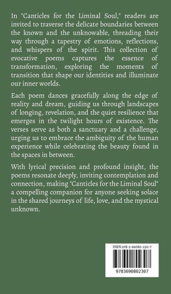 In "Canticles for the Liminal Soul," readers are invited to traverse the delicate boundaries between the known and the unknowable, threading their way through a tapestry of emotions, reflections, and whispers of the spirit. This collection of evocative poems captures the essence of transformation, exploring the moments of transition that shape our identities and illuminate our inner worlds. Each poem dances gracefully along the edge of reality and dream, guiding us through landscapes of longing, revelation, and the quiet resilience that emerges in the twilight hours of existence. The verses serve as both a sanctuary and a challenge, urging us to embrace the ambiguity of the human experience while celebrating the beauty found in the spaces in between. With lyrical precision and profound insight, the poems resonate deeply, inviting contemplation and connection, making "Canticles for the Liminal Soul" a compelling companion for anyone seeking solace in the shared journeys of life, love, and the mystical unknown.