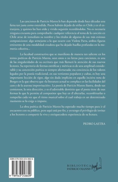 Las canciones de Patricio Manns le han deparado desde hace d cadas una fama tan justa como extendida. Pocos habr n dejado de o rlas en Chile y en el extranjero, y quienes las han o do y vivido seguir n record ndolas. No es necesaria ninguna encuesta para comprobarlo: cualquier referencia al tema de la canci n en Chile atrae de inmediato su nombre y los t tulos de algunas de sus m s exitosas composiciones: algo semejante a lo que ocurre con Violeta Parra, ambas figuras eminentes de una modalidad creadora que ha dejado huellas profundas en la memoria colectiva. La facultad constructiva que se manifiesta de manera tan saliente en los textos po ticos de Patricio Manns, sean estos o no letras para canciones, es una de las singularidades de su escritura que m s llamar la atenci n de sus nuevos lectores. Su repertorio de formas estr ficas y m tricas es de una amplitud considerable y su concreci n po tica es siempre afortunada: esa conciencia de los valores legados por la poes a tradicional, en sus vertientes populares y cultas, es hoy una importante lecci n de rigor, algo sin duda impl cito en aquella incisiva nota de Borges en la que observa que la literatura actual se complace en las facilidades del caos y de la azarosa improvisaci n . La poes a de Patricio Manns ilustra, desde sus comienzos, la otra direcci n, y es el admirable dominio que el poeta tiene de esas formas lo que le permite al compositor que hay en l alterarlas, recombinarlas o romperlas cada vez que el ritmo musical sobre el cual trabaja en un determinado momento se lo exige o impone. La obra po tica de Patricio Manns ha esperado mucho tiempo para ir al encuentro con su p blico, pero aqu est por fin, y yo tengo el privilegio de invitar a los lectores a compartir la viva y enriquecedora experiencia de su lectura.