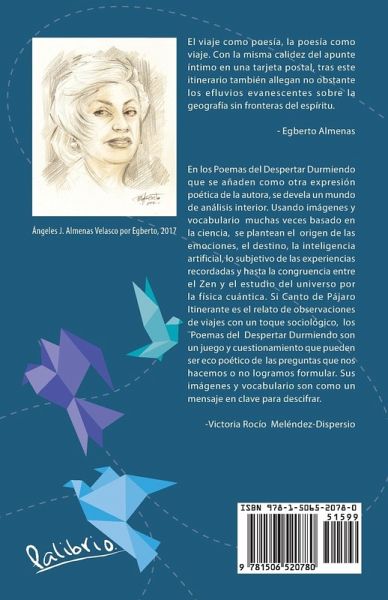 El viaje como poesía, la poesía como viaje. Con la misma calidez del apunte íntimo en una tarjeta postal, tras este itinerario también allegan no obstante los efluvios evanescentes sobre la geografía sin fronteras del espíritu. - Egberto Almenas En los Poemas del Despertar Durmiendo que se añaden como otra expresión poética de la autora, se devela un mundo de análisis interior. Usando imágenes y vocabulario muchas veces basado en la ciencia, se plantean el origen de las emociones, el destino, la inteligencia artificial, lo subjetivo de las experiencias recordadas y hasta la congruencia entre el Zen y el estudio del universo por la física cuántica. Si Canto de Pájaro Itinerante es el relato de observaciones de viajes con un toque sociológico, los ¿Poemas del Despertar Durmiendo son un juego y cuestionamiento que pueden ser eco poético de las preguntas que nos hacemos o no logramos formular. Sus imágenes y vocabulario son como un mensaje en clave para descifrar. -Victoria Rocío Meléndez-Dispersio