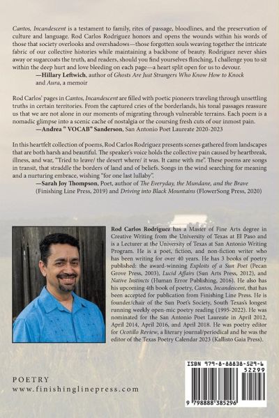 Cantos, Incandescent is a testimonial that runs the gamut through a multitude of realities of war, illness, heartbreak, and more. Various territories and stark observations are painted in cultural textures and landscapes that are sometimes pastoral and at other times, unforgiving. The different voices in each piece dare the reader to witness their collective, unvarnished truths. There is something for everyone within these pages. The messages and concepts imparted in this book will remain long after the last words echo in the reader's soul.