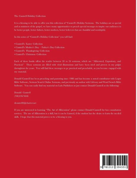Donald Cantrell has done it again, as he is now offering the reader "The Cantrell Holiday Collection" which is a series of four books. These books offer the reader over 20 sermons in each book, alliterated outlines, expository content, and practical insight.