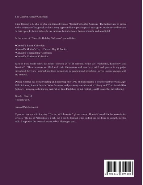 Donald Cantrell has did it again, as he offers the reader four books in his "The Cantrell Holiday Collection." These four books offer the reader over 20 sermons in each book, with expositiory, alliterated, and practical content.