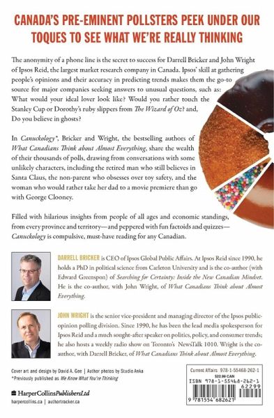 The anonymity of a phone line is the secret to the success for Darrell Bricker and John Wright of Ipsos Reid, the largest market research company in Canada. Ipsos' accuracy in gathering people's thoughts and predicting trends makes them to go-to source for major companies seeking answers to unusual questions, such as: What would your ideal lover look like? Would you rather touch the Stanley Cup or Dorothy's ruby slippers from The Wizard of Oz? And, do you believe in ghosts? In Canuckology, Wright and Bricker, the bestselling authors of What Canadians Think about Almost Everything, share with us the wealth of their thousands of polls, drawn from conversations with some unlikely characters, including the retired man who still believes in Santa Claus, the non-parent who freaks out about toy safety, and the woman who would rather take her dad to a movie premiere than George Clooney. Filled with hilarious insights from every province and territory, as well as from people of every age, gender and economic standing -- and peppered with fun factoids and quizzes -- Canuckology is compulsive, must-have reading for any Canadian.