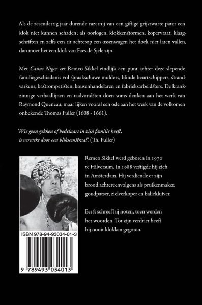 Als de zesendertig jaar durende razernij van een giftige grijszwarte pater een klok niet kunnen schaden; als oorlogen, klokkenstormen, kopervraat, klaagschriften en zelfs een rit achterop een ossenwagen het doek niet laten vallen, dan moet het een klok van Faes de Sjele zijn. Met Canus Niger zet Remco Sikkel eindlijk een punt achter deze slepende familiegeschiedenis vol spraakschuwe mulders, blinde beurtschippers, strandvarkens, bastrompetisten, kousenhandelaren en fabrieksarbeidsters. De krankzinnige verhaallijnen en taalvondsten doen soms denken aan het werk van Raymond Queneau, maar lijken vooral een ode aan het werk van de volkomen onbekende Thomas Fuller (1608 - 1661). 'Wie geen gekken of bedelaars in zijn familie heeft, is verwekt door een bliksemstraal'. (Th. Fuller)