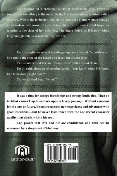 It was a time for college friendships and strong family ties. Then an incident causes Cap to embark upon a lonely journey. Without concerns for the past or future, he embraces each new experience and adventure with good intentions-and he never loses touch with the one decent character quality that dwells within his soul. Cap proves that love and life are conditional, and both can be measured by a simple act of kindness.