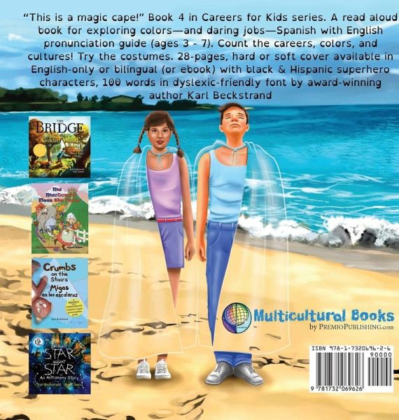 (Colors, careers, language) "Ésta es una capa de colores mágica." Un libro sobre carreras, culturas, y colores; este libro para niños de 3 a 7 años contiene actividades de búsqueda, superhéroes hispanos y africanos, y vívidas imágenes para ayudar con la comprensión del vocabulario. ¡A ponerse los disfraces! Diversión y aprendizaje para toda la familia. Great Cape o' Colors--try on superhero costumes! Kids love to count cultures, careers, and colors! A read-aloud children's book with black and Hispanic superheroes (for beginning readers ages 3 -7 years, preschool - second grade) available in English-only, bilingual, hard or soft cover, coloring book, and ebook. 100 read-aloud words, online secrets: PremioBooks #1 Careers for Kids (multicultural) series. Get all four: Bright Star, Night Star: An Astronomy Story; Ma MacDonald Flees the Farm; The Bridge of the Golden Wood: A Parable on How to Earn a Living (see ChildrenEarn). The perfect length book for kids (not too long for adults): 28 full-color illustrations (8.5"x8.5"). 100 palabras en español escrito por autor y profesor Karl Beckstrand (4 Spanish Books for Kids -- Haz clic arriba para ver sus 60 libros multiculturales), ilustrado por John Collado. "Perfecto para niños de Pre-escolar y fácil lectura para primaria....excelente para los profesores". - Maritza Mejia, autora/educadora. Ordene su ejemplar de este libro o e-book en inglés o bilingüe (con guía de pronunciación); 28 páginas; tapa dura o tapa blanda, o libro para colorear. Más diversión: PremioBooks. For free career lesson plans, images, and video book trailer, see PremioBooks (Premio Publishing & Gozo Books, worldwide rights © June 2018), libraries y tiendas de calidad. LCCN: 2018947922, JUV009020, JUV006000, JUV051000, JUV071000, FOR026000, FOR007000, JUV011010, JUV011030, JNF013020, JNF020011, BUS012000; JNF020010, Hard ISBN: 978-1732069626, ebook ISBN: 978-1370650736, Soft 978-1986734066