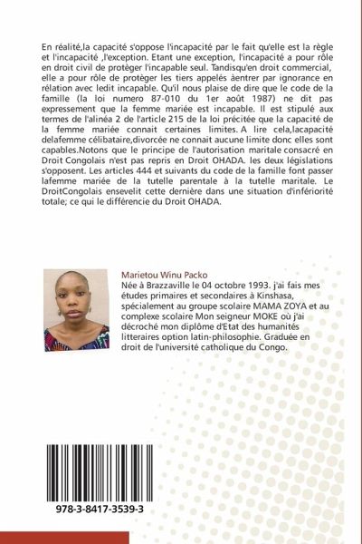 En réalité,la capacité s'oppose l'incapacité par le fait qu'elle est la règle et l'incapacité ,l'exception. Etant une exception, l'incapacité a pour rôle en droit civil de protèger l'incapable seul. Tandisqu'en droit commercial, elle a pour rôle de protèger les tiers appelés àentrer par ignorance en rélation avec ledit incapable. Qu'il nous plaise de dire que le code de la famille (la loi numero 87-010 du 1er août 1987) ne dit pas expressement que la femme mariée est incapable. Il est stipulé aux termes de l'alinéa 2 de l'article 215 de la loi précitée que la capacité de la femme mariée connait certaines limites. A lire cela,lacapacité delafemme célibataire,divorcée ne connait aucune limite donc elles sont capables.Notons que le principe de l'autorisation maritale consacré en Droit Congolais n'est pas repris en Droit OHADA. les deux législations s'opposent. Les articles 444 et suivants du code de la famille font passer lafemme mariée de la tutelle parentale à la tutelle maritale. Le DroitCongolais ensevelit cette dernière dans une situation d'infériorité totale; ce qui le différencie du Droit OHADA.