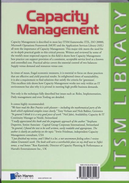 Capacity Management is described in most key ITSM frameworks: ITIL, ISO 20000 Microsoft Operations Framework (MOF) and the Application Service Library (ASL) all note the importance of Capacity Management. This major title meets the need for an in-depth practical guide to this critical process. Written and reviewed by some of the worlds most respected experts in this field it shows how Capacity Management best practice can support provision of a consistent, acceptable service level at a known and controlled cost. Practical advice covers the essential control of two balances: Supply versus demand and resources versus cost.