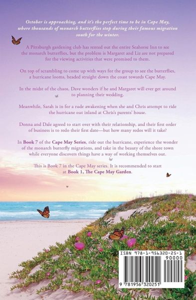 October is approaching, and it's the perfect time to be in Cape May, where thousands of monarch butterflies stop during their famous migration south for the winter. A Pittsburgh gardening club has rented out the entire Seahorse Inn to see the monarch butterflies, but the problem is Margaret and Liz are not prepared for the viewing activities that were promised to them. On top of scrambling to come up with ways for the group to see the butterflies, a hurricane looms, headed straight down the coast towards Cape May. In the midst of the chaos, Dave wonders if he and Margaret will ever get around to planning their wedding. Meanwhile, Sarah is in for a rude awakening when she and Chris attempt to ride the hurricane out inland at Chris's parents' house. Donna and Dale agreed to start over with their relationship, and their first order of business is to redo their first date-but how many redos will it take? In Book 7 of the Cape May Series, ride out the hurricane, experience the wonder of the monarch butterfly migrations, and take in the beauty of the shore town while everyone discovers things have a way of working themselves out. This is Book 7 in the Cape May series. It is recommended to start at Book 1, The Cape May Garden.
