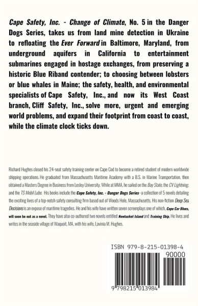 Cape Safety, Inc. - Change of Climate, No. 5 in the Danger Dogs Series, takes us from land mine detection in Ukraine to refloating the Ever Forward in Baltimore, Maryland, from underground aquifers in California to entertainment submarines engaged in hostage exchanges, from preserving a historic Blue Riband contender; to choosing between lobsters or blue whales in Maine; the safety, health, and environmental specialists of Cape Safety, Inc., and now its West Coast branch, Cliff Safety, Inc., solve more, urgent and emerging world problems, and expand their footprint from coast to coast, while the climate clock ticks down.