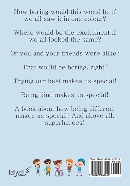 How boring would this world be if we all saw it in one colour? Where would be the excitement if we all looked the same? Or you and your friends were alike? That would be boring, right? Trying our best makes us special! Being kind makes us special! A book about how being different makes us special! And above all, superheroes!