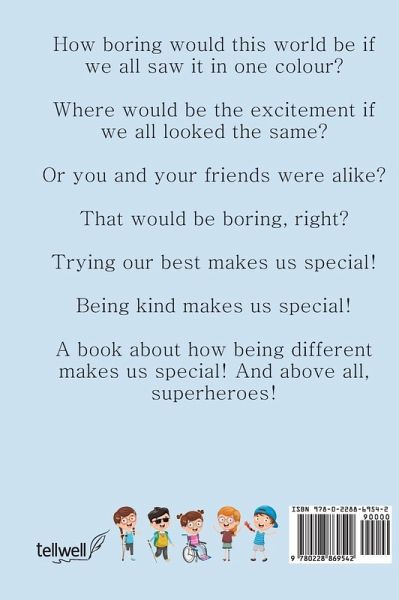 How boring would this world be if we all saw it in one colour? Where would be the excitement if we all looked the same? Or you and your friends were alike? That would be boring, right? Trying our best makes us special! Being kind makes us special! A book about how being different makes us special! And above all, superheroes!