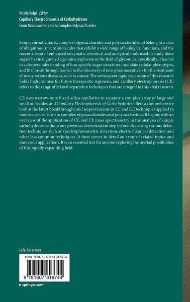 Simple carbohydrates, complex oligosaccharides and polysaccharides all belong to a class of ubiquitous (macro)molecules that exhibit a wide range of biological functions, and the recent advent of enhanced enzymatic, chemical and analytical tools used to study these sugars has inaugurated a genuine explosion in the field of glycomics. Specifically, it has led to a deeper understanding of how specific sugar structures modulate cellular phenotypes, and that breakthrough has led to the discovery of new pharmaceuticals for the treatment of many serious diseases, such as cancer. The subsequent rapid expansion of this research holds high promise for future therapeutic regimens, and capillary electrophoresis (CE) refers to the range of related separation techniques that are integral to this vital research.CE uses narrow-bore fused-silica capillaries to separate a complex array of large and small molecules, and Capillary Electrophoresis of Carbohydrates offers a comprehensive look at the latest breakthroughs and improvements in CE and CE techniques applied to monosaccharides up to complex oligosaccharides and polysaccharides. It begins with an overview of the application of CE and CE- mass spectrometric in the analysis of simple carbohydrates without any previous derivatization step before discussing various detection techniques such as spectrophotometric detection, electrochemical detection and other less common techniques. It then covers in detail an array of related topics and numerous applications. It is an essential text for anyone exploring the myriad possibilities of this rapidly expanding field.
