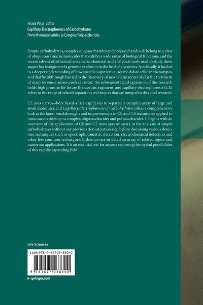 Simple carbohydrates, complex oligosaccharides and polysaccharides all belong to a class of ubiquitous (macro)molecules that exhibit a wide range of biological functions, and the recent advent of enhanced enzymatic, chemical and analytical tools used to study these sugars has inaugurated a genuine explosion in the field of glycomics. Specifically, it has led to a deeper understanding of how specific sugar structures modulate cellular phenotypes, and that breakthrough has led to the discovery of new pharmaceuticals for the treatment of many serious diseases, such as cancer. The subsequent rapid expansion of this research holds high promise for future therapeutic regimens, and capillary electrophoresis (CE) refers to the range of related separation techniques that are integral to this vital research.CE uses narrow-bore fused-silica capillaries to separate a complex array of large and small molecules, and Capillary Electrophoresis of Carbohydrates offers a comprehensive look at the latest breakthroughs and improvements in CE and CE techniques applied to monosaccharides up to complex oligosaccharides and polysaccharides. It begins with an overview of the application of CE and CE- mass spectrometric in the analysis of simple carbohydrates without any previous derivatization step before discussing various detection techniques such as spectrophotometric detection, electrochemical detection and other less common techniques. It then covers in detail an array of related topics and numerous applications. It is an essential text for anyone exploring the myriad possibilities of this rapidly expanding field.