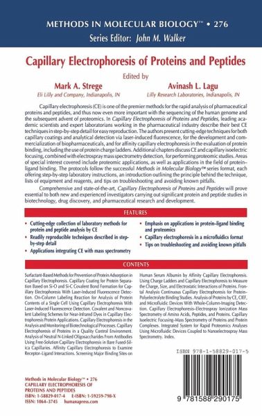 Expert academic and pharmaceutical researchers describe their best capillary electrophoresis techniques for protein and peptide analysis. The authors present cutting-edge techniques for both capillary coatings and analytic detection via laser-induced fluorescence, for the development and commercialization of biopharmaceuticals, and for affinity capillary electrophoresis in the evaluation of protein binding, including the use of protein charge ladders. Areas of special interest covered include combining CE and capillary isoelectric focusing with electrospray mass spectrometry detection to perform proteomic studies and applications in the field of protein-ligand binding.
