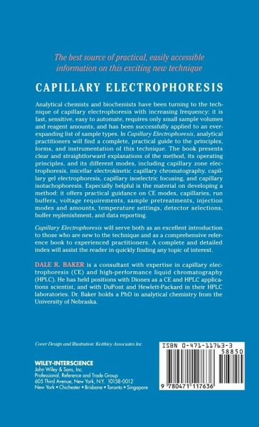 The best source of practical, easily accessible information on this exciting new technique CAPILLARY ELECTROPHORESIS Analytical chemists and biochemists have been turning to the technique of capillary electrophoresis with increasing frequency: it is fast, sensitive, easy to automate, requires only small sample volumes and reagent amounts, and has been successfully applied to an ever-expanding list of sample types. In Capillary Electrophoresis, analytical practitioners will find a complete, practical guide to the principles, forms, and instrumentation of this technique. The book presents clear and straightforward explanations of the method, its operating principles, and its different modes, including capillary zone electrophoresis, micellar electrokinetic capillary chromatography, capillary gel electrophoresis, capillary isoelectric focusing, and capillary isotachophoresis. Especially helpful is the material on developing a method: it offers practical guidance on CE modes, capillaries, run buffers, voltage requirements, sample pretreatments, injection modes and amounts, temperature settings, detector selections, buffer replenishment, and data reporting. Capillary Electrophoresis will serve both as an excellent introduction to those who are new to the technique and as a comprehensive reference book to experienced practitioners. A complete and detailed index will assist the reader in quickly finding any topic of interest.