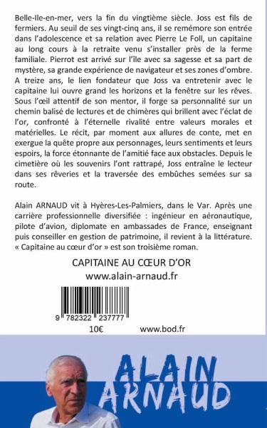 Belle-Ile-en-mer, vers la fin du vingtième siècle. Joss est fils de fermiers. Au seuil de ses vingt-cinq ans, il se remémore son entrée dans l'adolescence et sa relation avec Pierre Le Foll, un capitaine au long cours à la retraite venu s'installer près de la ferme familiale. Pierrot est arrivé sur l'île avec sa sagesse et sa part de mystère, sa grande expérience de navigateur et ses zones d'ombre. A treize ans, le lien fondateur que Joss va entretenir avec le capitaine lui ouvre grand les horizons et la fenêtre sur les rêves. Sous l'oeil attentif de son mentor, il forge sa personnalité sur un chemin balisé de lectures et de chimères qui brillent avec l'éclat de l'or, confronté à l'éternelle rivalité entre valeurs morales et matérielles. Le récit, par moment aux allures de conte, met en exergue la quête propre aux personnages, leurs sentiments et leurs espoirs, la force étonnante de l'amitié face aux obstacles. Depuis le cimetière où les souvenirs l'ont rattrapé, Joss entraîne lelecteur dans ses rêveries et la traversée des embûches semées sur sa route.