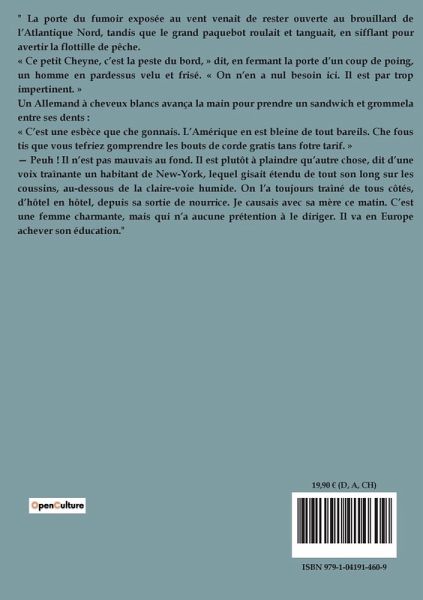 " La porte du fumoir exposée au vent venait de rester ouverte au brouillard de l¿Atlantique Nord, tandis que le grand paquebot roulait et tanguait, en sifflant pour avertir la flottille de pêche. « Ce petit Cheyne, c¿est la peste du bord, » dit, en fermant la porte d¿un coup de poing, un homme en pardessus velu et frisé. « On n¿en a nul besoin ici. Il est par trop impertinent. » Un Allemand à cheveux blancs avança la main pour prendre un sandwich et grommela entre ses dents : « C¿est une esbèce que che gonnais. L¿Amérique en est bleine de tout bareils. Che fous tis que vous tefriez gomprendre les bouts de corde gratis tans fotre tarif. » ¿ Peuh ! Il n¿est pas mauvais au fond. Il est plutôt à plaindre qüautre chose, dit d¿une voix traînante un habitant de New-York, lequel gisait étendu de tout son long sur les coussins, au-dessous de la claire-voie humide. On l¿a toujours traîné de tous côtés, d¿hôtel en hôtel, depuis sa sortie de nourrice. Je causais avec sa mère ce matin. C¿est une femme charmante, mais qui n¿a aucune prétention à le diriger. Il va en Europe achever son éducation."