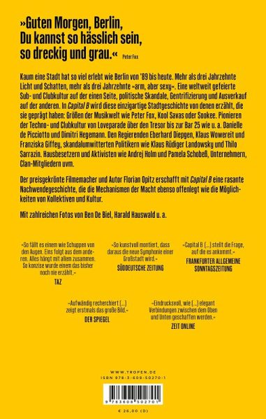 Kaum eine Stadt hat so viel erlebt wie Berlin von '89 bis heute. Mehr als drei Jahrzehnte Licht und Schatten, mehr als drei Jahrzehnte »arm, aber sexy«. Eine weltweit gefeierte Sub- und Clubkultur auf der einen Seite, politische Skandale, Gentrifizierung und Ausverkauf auf der anderen. In Capital B wird diese einzigartige Stadtgeschichte von denen erzählt, die sie geprägt haben: Größen der Musikwelt wie Peter Fox, Kool Savas oder Sookee. Pionieren der Techno- und Clubkultur von Loveparade über den Tresor bis zur Bar 25 wie u. a. Danielle de Picciotto und Dimitri Hegemann. Den Regierenden Eberhard Diepgen, Klaus Wowereit und Franziska Giffey, skandalumwitterten Politikern wie Klaus Rüdiger Landowsky und Thilo Sarrazin. Hausbesetzern und Aktivisten wie Andrej Holm und Pamela Schobeß, Unternehmern, Clan-Mitgliedern uvm.