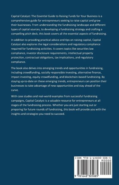 Capital Catalyst: The Essential Guide to Raising Funds for Your Business is a comprehensive guide for entrepreneurs seeking to raise capital and grow their businesses. From understanding the fundraising landscape and different types of capital sources, to developing a fundraising strategy and crafting a compelling pitch deck, this book covers all the essential aspects of fundraising. In addition to providing practical advice and tips on raising capital, Capital Catalyst also explores the legal considerations and regulatory compliance required for fundraising activities. It covers topics like securities law compliance, investor disclosure requirements, intellectual property protection, contractual obligations, tax implications, and regulatory compliance. The book also delves into emerging trends and opportunities in fundraising, including crowdfunding, socially responsible investing, alternative finance, impact investing, equity crowdfunding, and blockchain-based fundraising. By staying up-to-date on these emerging trends, entrepreneurs can position their businesses to take advantage of new opportunities and stay ahead of the curve. With case studies and real-world examples from successful fundraising campaigns, Capital Catalyst is a valuable resource for entrepreneurs at all stages of the fundraising process. Whether you are just starting out or preparing for future rounds of fundraising, this book will provide you with the insights and strategies you need to succeed.