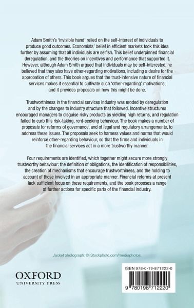 Adam Smith's 'invisible hand' relied on the self-interest of individuals to produce good outcomes. Economists' belief in efficient markets took this idea further by assuming that all individuals are selfish. This belief underpinned financial deregulation, and the theories on incentives and performance which supported it. However, although Adam Smith argued that although individuals may be self-interested, he argued that they also have other-regarding motivations, including a desire for the approbation of others. This book argues that the trust-intensive nature of financial services makes it essential to cultivate such other-regarding motivations, and it provides proposals on how this might be done.