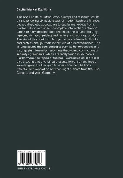 Prologue.- 1. Equilibrium versus Market Imperfections.- 2. Questions and Answers.- The Hybrid Model and Related Approaches to Capital Market Equilibria.- 1. Introduction.- 2. Portfolio Models Based on Different Sets of Parameters.- 3. Rationale of the Hybrid Model.- 4. Applications of the Hybrid Model.- 5. Appendix.- References.- Portfolio Decisions and Capital Market Equilibria Under Incomplete Information.- 1. Introduction.- 2. Risk Situation with Regard to the Prior Parameters: A Two-Level Bayes Approach.- 3. Risk Situation with Regard to the Prior Parameters: Lin's Approach.- 4. Partial Uncertainty with Regard to the Prior Parameters.- 5. Asset Pricing under Uncertainty.- References.- Option Valuation: Theory and Empirical Evidence.- 1. Introduction.- 2. Option Valuation Theory.- 3. Empirical Tests of Option Valuation.- 4. Appendix: Formulae for the Evaluation of European Calls.- References.- The Value of Security Agreements.- 1. A Survey of Credit Support Decision Models.- 2. Neoclassical Theory and Secured Debt.- 3. The Theory of Credit Support Decisions in the Light of the Economics of Information.- 4. A Scheme of Credit Contract Covenants.- 5. The Efficiency of Securing Debt.- 6. Appendix: Secured Debt and Uncertainty.- References.- Asset Pricing in a Small Economy: A Test of the Omitted Assets Model.- 1. Introduction.- 2. Portfolio Based Tests of Efficiency.- 3. Omitted Assets.- 4. The Data.- 5. Efficiency of the Canadian Market Index.- 6. Tests of the Omitted Assets Hypothesis.- Appendix: Iterative Maximum Likelihood Procedure.- References.- The Simple Analytics of Arbitrage.- 1. General Equilibrium, Modern Finance, and Arbitrage Theory.- 2. An Example, its Generalization, and the Question.- 3. Arbitrage versus Equilibrium.- 4. Derivative Contracts inComplete Capital Markets.- References.- About Contributors.- Author Index.