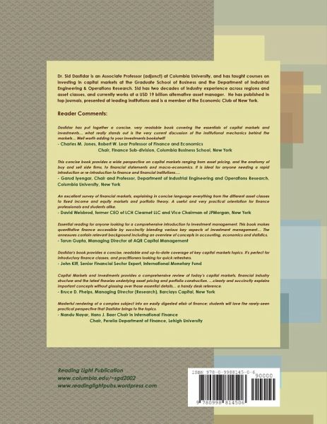 This intermediate book on the financial capital markets goes beyond basic financial concepts, and discusses the plumbing and the mechanics of the markets. It requires no prior background, and is accessible to students, practitioners, journalists and enthusiasts. This book covers the basics of financial institutions, instruments (debt, equity and options) and mentions new developments such as fintech and regulation. Compared to other books, this book is more concise and goes beyond the theory. It delves into institutional details rather than only discussing conceptual issues; the plumbing in the markets does matter! The book also introduces tools such as Bloomberg and has annexures on accounting, macroeconomics and statistics for introductory students. In that sense, it lies somewhere in between a traditional textbook and a reference book, and requires no prior finance background. Dr. Sid Dastidar (www.columbia.edu/~sgd2002) teaches at Columbia University, at the IEOR Department and earlier at the Graduate School of Business. Sid has two decades of industry experience, buy-side and sell-side, across asset classes/ regions. This book targets people who need a rapid orientation in finance, and need to apply the concepts right away. Key features include: Self-published by a professor at a top institution and an industry veteran, thus providing inexpensive access to distilled content. Adopted by top universities and Wall Street firms, and endorsed by leading faculty and industry practitioners. Meant to help students and practitioners understand the essentials of capital markets, quickly. The book emphasizes brevity and compactness, ideally suited to current learning and pedagogy styles. Discusses the structure of various financial institutions, and the roles they play in the allocation of capital. Requires no specific prerequisites, except possibly some fluency in high school/ undergraduate math. Basic information on financial statements, macroeconomics, statistics and Bloomberg are included in self-contained annexures at the end. The annexures can help bridge any gaps in background that readers may have to understand the content in the body of the book thoroughly and build on it. Practitioners currently employed in the finance profession will find this book useful in refreshing basic concepts in a part of the market they do not deal with regularly. Students of finance will find the book useful in teaching them preliminary/ intermediate ideas, putting facts in context and ¿connecting the dots.¿ Because of the book¿s introductory nature, it is heavy on principles, mechanics, details, etc., apart from some perspective. This book gives readers the tools to formulate opinions and evaluate the opinions of others, but it does not offer direct opinions on the current market. Professionals who will find it useful include: Finance professionals needing a quick refresher on a market that they do not deal with regularly. Professionals with qualifications in other disciplines looking to switch careers into finance. Students with prior background in another discipline joining a Masters degree program, specializing in finance (MBA, quantitative finance, etc.) Advanced undergraduate (or even high school!) students deciding whether finance is right for them. Mid-career professionals in another industry, serving financial services clients, need to understand the basics of financial markets better. For example, Fintech professionals with a technology background are looking to connect more with mainstream finance companies. Or, it may be a curious individual who simply wants to understand the financial periodicals better, and possibly make more sensible investment decisions!