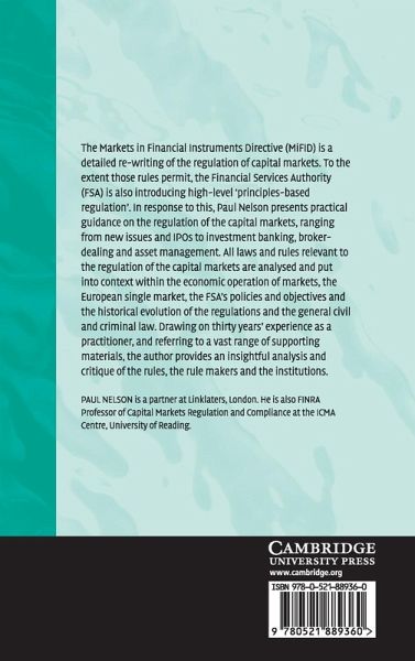 The Markets in Financial Instruments Directive (MiFID) is a detailed re-writing of the regulation of capital markets. To the extent those rules permit, the Financial Services Authority (FSA) is also introducing high-level 'principles-based regulation'. In response to this, Paul Nelson presents practical guidance on the regulation of the capital markets, ranging from new issues and IPOs to investment banking, broker-dealing and asset management. All laws and rules relevant to the regulation of the capital markets are explained and put into context within the economic operation of markets, institutions and products, the European Single Market, the FSA's policies and objectives, the historical evolution of the regulations and the general civil and criminal law. Drawing on 30 years' experience as a practitioner, and referring to a vast range of supporting materials, the author provides an insightful analysis and critique of the rules, the rule makers and the institutions.