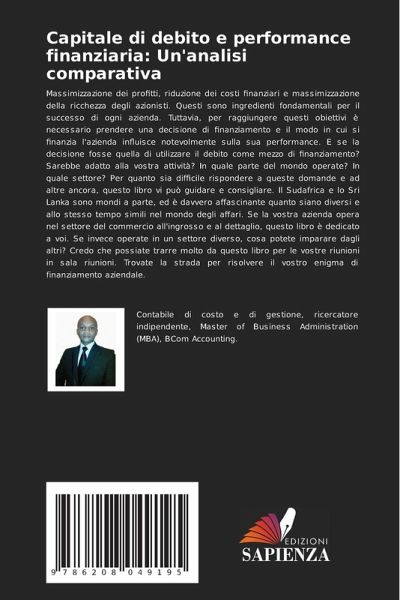 Massimizzazione dei profitti, riduzione dei costi finanziari e massimizzazione della ricchezza degli azionisti. Questi sono ingredienti fondamentali per il successo di ogni azienda. Tuttavia, per raggiungere questi obiettivi è necessario prendere una decisione di finanziamento e il modo in cui si finanzia l'azienda influisce notevolmente sulla sua performance. E se la decisione fosse quella di utilizzare il debito come mezzo di finanziamento? Sarebbe adatto alla vostra attività? In quale parte del mondo operate? In quale settore? Per quanto sia difficile rispondere a queste domande e ad altre ancora, questo libro vi può guidare e consigliare. Il Sudafrica e lo Sri Lanka sono mondi a parte, ed è davvero affascinante quanto siano diversi e allo stesso tempo simili nel mondo degli affari. Se la vostra azienda opera nel settore del commercio all'ingrosso e al dettaglio, questo libro è dedicato a voi. Se invece operate in un settore diverso, cosa potete imparare dagli altri? Credo che possiate trarre molto da questo libro per le vostre riunioni in sala riunioni. Trovate la strada per risolvere il vostro enigma di finanziamento aziendale.