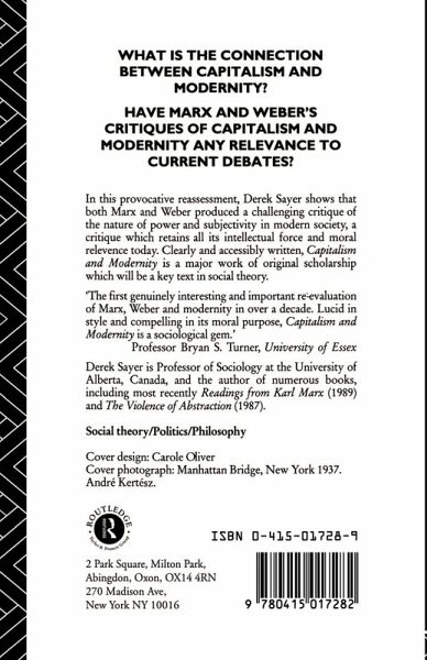 The nature of modernity, and its connection with capitalism, are questions at the heart of contemporary sociological debate. In "Capitalism and Modernity," Derek Sayer critically re-examines the answers given by two of the greatest social theorists of capitalism, Karl Marx and Max Weber. He provides a fresh reading of both men's work, and breaks new ground in showing the remarkable relevance of their thought to the modern condition. From behind the well-worn stereotypes of "the Marx-Weber debate" emerges a disturbing critique of modern sociality, subjectivity, and power which has lost none of its intellectual force or moral relevance. Clearly and compellingly written, "Capitalism and Modernity" is a major work of original scholarship. As an authoritative yet accessible commentary on a debate central to modern sociology and politics, this work is likely to become a seminal text in social theory.