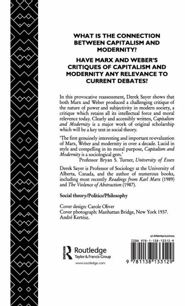 First Published in 2004. The nature of modernity, and its connection with capitalism, are questions at the forefront of contemporary sociological debate. Derek Sayer re-examines the answers given by Karl Marx and Max Weber, authors of two of the most profound sociological critiques of modernity. His reassessment of Marx and Weber on capitalism and modernity provides a new reading which reveals the remarkable consonances between their sociologies of the modern condition. Going beyond the well-known stereotypes of 'the Marx-Weber debate', Professor Sayer shows that both Marx and Weber produced a challenging critique of the nature of power and subjectivity in modern society, a critique which retains all its intellectual force and moral relevance today. A major work of original scholarship, Capitalism and Modernity is clearly and accessibly written. It is an authoritative and provocative commentary on a debate central to modern sociology and politics and will be a key text in social theory for students of sociology, politics and philosophy.