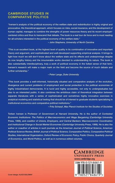 This book, first published in 2005, builds on institutionalist theory in both economics and political science to offer a general political economy framework for the study of welfare capitalism. Based on the key idea that social protection in a modern economy, both inside and outside the state, can be understood as protection of specific investments in human capital, the book offers a systematic explanation of popular preferences for redistributive spending, the economic role of political parties and electoral systems, and labor market stratification (including gender inequality). Contrary to the popular idea that competition in the global economy undermines international differences in the level of social protection, the book argues that these differences are made possible by a high international division of labor. Such a division is what allows firms to specialize in production that requires an abundant supply of workers with specific skills, and hence high demand for protection.