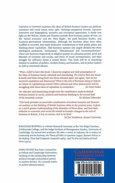 Capitalism in Contention examines the ideas of British business leaders on political, economic and social issues since 1960. Using unexplored records, interviews and both narrative and conceptual approaches, it sheds light on the Wilson, Heath and Thatcher periods from business points of view, on the 'mixed economy' and the 'New Right', the peak business bodies (CBI, BIM, IOD etc), and business-government relationships. Although the business ideas were often muffled or secreted, they made distinctive contributions to both public policy and thinking about 'capitalism'. The authors highlight three main ideological tendencies of elite business opinion, 'revisionism', 'liberationism' and reconstructionism'. These saw business respectively as adaptive partner in a pluralist system, pivot and liberator, and focus of social reconstruction, and their struggle for influence forms a central theme. This 1997 book will be of absorbing interest to students of politics, modern history and business, and to policy makers as well as concerned citizens.