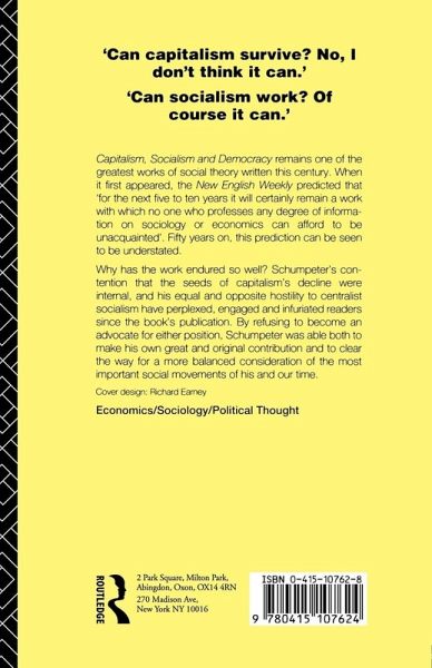 Capitalism, Socialism and Democracy remains one of the greatest works of social theory written this century. When it first appeared the New English Weekly predicted that `for the next five to ten years it will cetainly remain a work with which no one who professes any degree of information on sociology or economics can afford to be unacquainted.' Fifty years on, this prediction seems a little understated.