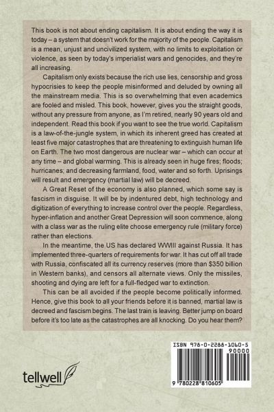 This book is not about ending capitalism. It is about ending the way it is today - a system that doesn't work for the majority of the people. Capitalism is a mean, unjust and uncivilized system, with no limits to exploitation or violence, as seen by today's imperialist wars and genocides, and they're all increasing. Capitalism only exists because the rich use lies, censorship and gross hypocrisies to keep the people misinformed and deluded by owning all the mainstream media. This is so overwhelming that even academics are fooled and misled. This book, however, gives you the straight goods, without any pressure from anyone, as I'm retired, nearly 90 years old and independent. Read this book if you want to see the true world. Capitalism is a law-of-the-jungle system, in which its inherent greed has created at least five major catastrophes that are threatening to extinguish human life on Earth. The two most dangerous are nuclear war - which can occur at any time - and global warming. This is already seen by huge fires, floods, hurricanes, decreasing farmland, food, water and so forth. Uprisings will result and emergency (martial law) will be decreed. A Great Reset of the economy is also planned, which some say is fascism in disguise. It will be by indentured debt, high technology and digitization of everything to increase control over the people. Regardless, hyper-inflation and another Great Depression will soon commence, along with a class war as the ruling elite choose emergency rule (military force) rather than elections. In the meantime, the US has declared WWIII against Russia. It has implemented three-quarters of requirements for war. It has cut off all trade with Russia, confiscated all its currency reserves (more than $350 billion in Western banks), and censors all alternate views. Only the missiles, shooting and dying are left for a full-fledged war to extinction. This can be all avoided if the people become politically informed. Hence, give this book to all your friends before it is banned, martial law is decreed and fascism begins. The last train is leaving. Better jump on board before it's too late, as the catastrophes are all knocking. Do you hear them?