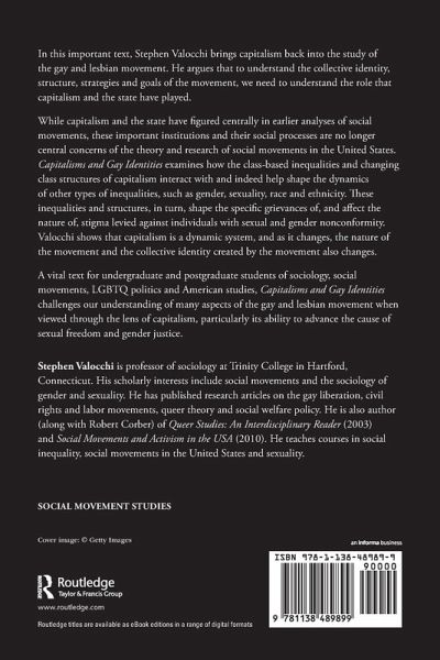 In this important text, Stephen Valocchi brings capitalism back into the study of the gay and lesbian movement. He argues that to understand the collective identity, structure, strategies and goals of the movement, we need to understand the role that capitalism and the state have played. While capitalism and the state have figured centrally in earlier analyses of social movements, these important institutions and their social processes are no longer central concerns of the theory and research of social movements in the United States. Capitalisms and Gay Identities examines how the class-based inequalities and changing class structures of capitalism interact with and indeed help shape the dynamics of other types of inequalities, such as gender, sexuality, race and ethnicity. These inequalities and structures, in turn, shape the specific grievances of, and affect the nature of, stigma levied against individuals with sexual and gender nonconformity. Valocchi shows that capitalism is a dynamic system, and as it changes, the nature of the movement and the collective identity created by the movement also changes. A vital text for undergraduate and postgraduate students of sociology, social movements, LGBTQ politics and American studies, Capitalisms and Gay Identities challenges our understanding of many aspects of the gay and lesbian movement when viewed through the lens of capitalism, particularly its ability to advance the cause of sexual freedom and gender justice.