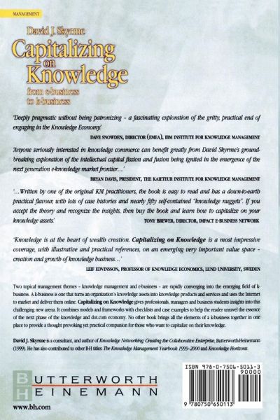 Many organizations are embracing knowledge management as a source of strategic advantage. But already people are asking: "what comes next?" Likewise almost every large organization is heavily involved in e-commerce and turning their organizations into e-businesses. At the moment most e-commerce is focused on selling traditional products and services through the new medium of the Internet. However, the more an organization evolves into an e-business, the more they can exploit knowledge flows between themselves and their marketplace. This book draws together the two strands of knowledge and e-business into the emerging field that this book has called k-business. A k-business is one that turns an organization's knowledge assets into knowledge products and services and uses the Internet to market and deliver them online. Despite its newness, the Delphi Group have forecast that within 5 years person-to-person information e-commerce (a major aspect of k-business) will be a $5 billion business leveraging $50 billion in sales of other products and services. Capitalizing on Knowledge aims to give professionals and managers early insights into how to develop successful k-businesses. It takes a critical and balanced view of the building blocks of a k-business including knowledge productizing, e-commerce enablers and Internet marketing. It draws on lessons from successes and failures in the dot.com landscape and of the early pioneers of knowledge markets. The writing style engenders interest and readability supported by diagrams, screen images, check lists and frameworks. There are 'points to ponder' to stimulate thinking and decision-making. Five case studies and over 50 illustrative examples provide insights into the application of the book's concepts. No other book brings all the elements of a k-business together in one place to provide a thought provoking yet practical companion for those who want to capitalize on their knowledge.