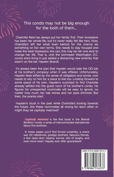 This condo may not be big enough for the both of them... Charlotte Reid has always put her family first. Their bookstore was her whole life, but it's never really felt like hers. Now, Charlotte's left her small town behind for the chance to do something on her own terms. She needs to stay focused and make the best impression she can; this might be her one shot to change her life. That is, until the borrowed Washington D.C. condo she's living in just added a distracting new amenity that wasn't on the list: Hayden Brandt. It's always been the plan that Hayden would take the CIO job at his brother's company when offered it. Unfortunately, Hayden feels stifled by the sense of obligation and worse, now needs to rely on him for a place to live, too. Looking forward to some space of his own, Hayden's surprised to find Charlotte already settled into the guest room of his brother's condo. He figures his unexpected roommate will be easy to ignore, no matter how much her hair shines and her eyes shimmer. But then, the pranks start. Hayden's stuck in the past while Charlotte's looking towards the future. Are these roommates all wrong for each other or might they be capitally matched? Capitally Matched is the first book in the Brandt Brothers novels, a series of interconnected standalones about five brothers. In these pages you'll find forced proximity, a prank war, DC references, gossipy brothers, fabulous friends, a few open-door steamy scenes, lots of laughs, and even more heart. Happily ever after guaranteed!