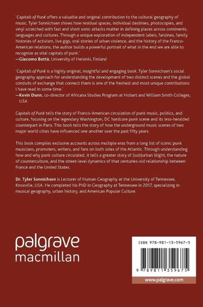 Capitals of Punk tells the story of Franco-American circulation of punk music, politics, and culture, focusing on the legendary Washington, DC hardcore punk scene and its less-heralded counterpart in Paris. This book tells the story of how the underground music scenes of two major world cities have influenced one another over the past fifty years. This book compiles exclusive accounts across multiple eras from a long list of iconic punk musicians, promoters, writers, and fans on both sides of the Atlantic. Through understanding how and why punk culture circulated, it tells a greater story of (sub)urban blight, the nature of counterculture, and the street-level dynamics of that centuries-old relationship between France and the United States.