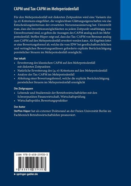 Für den Mehrperiodenfall mit diskreten Zeitpunkten wird eine Variante des (µ, s)-Kriteriums eingeführt, die vergleichbare Glättungseigenschaften wie das Entscheidungskriterium der erwarteten Nutzenmaximierung hat. Unterstellt man, dass die Investitionsmöglichkeiten zu jedem Zeitpunkt unabhängig vom Umweltzustand sind, so gelten die Aussagen des CAPM analog auch im Mehrperiodenfall. Steffen Hüper zeigt auf, dass das Tax-CAPM von Brennan analog zum CAPM auf den Mehrperiodenfall erweitert werden kann. Als Ergebnis leitet er eine Bewertungsformel ab, welche die vom IDW bei gesellschaftsrechtlichen und vertraglichen Bewertungsanlässen geforderte explizite Berücksichtigung persönlicher Steuern im Mehrperiodenfall ermöglicht.