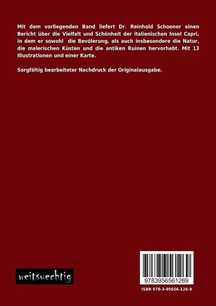 Mit dem vorliegenden Band liefert Dr. Reinhold Schoener einen Bericht über die Vielfalt und Schönheit der italienischen Insel Capri, in dem er sowohl die Bevölerung, als auch insbesondere die Natur, die malerischen Küsten und die antiken Ruinen hervorhebt. Mit 13 Illustrationen und einer Karte.