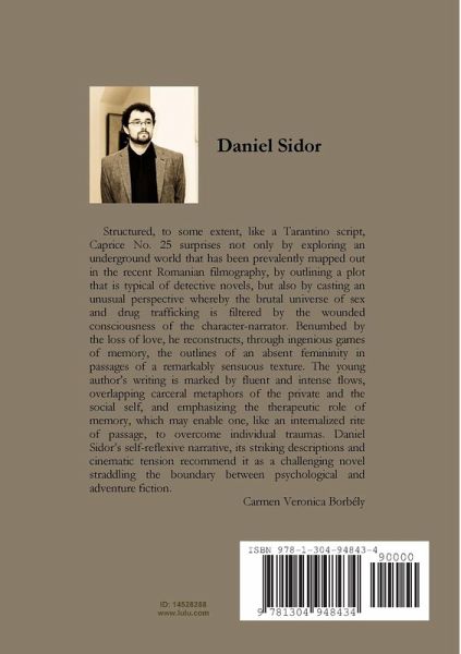 Structured, to some extent, like a Tarantino script, Caprice No. 25 surprises not only by exploring an underground world , by outlining a plot that is typical of detective novels, but also by casting an unusual perspective whereby the brutal universe of sex and drug trafficking is filtered by the wounded consciousness of the character-narrator. Benumbed by the loss of love, he reconstructs, through ingenious games of memory, the outlines of an absent femininity in passages of a remarkably sensuous texture. The young author's writing is marked by fluent and intense flows, overlapping carceral metaphors of the private and the social self, and emphasizing the therapeutic role of memory, which may enable one, like an internalized rite of passage, to overcome individual traumas. Daniel Sidor's self-reflexive narrative, its striking descriptions and cinematic tension recommend it as a challenging novel straddling the boundary between psychological and adventure fiction.